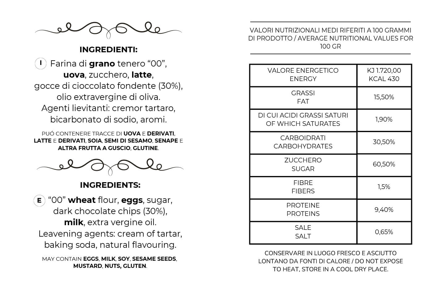 Ingredienti: Farina di grano tenero “00”, uova, zucchero, gocce di cioccolato fondente (30%), latte, olio extravergine di oliva.