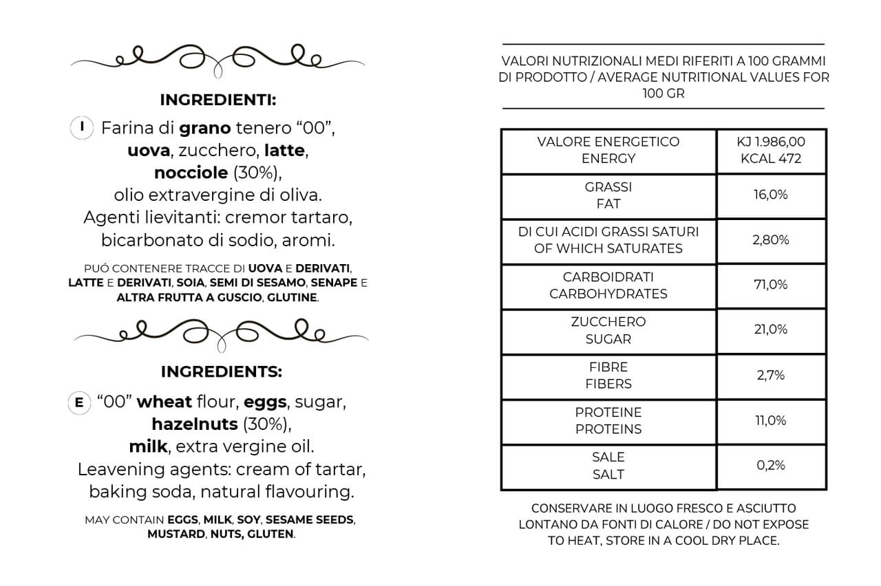 Ingredienti: Farina di grano tenero “00”, uova, zucchero, nocciole (30%), latte, olio extravergine di oliva.